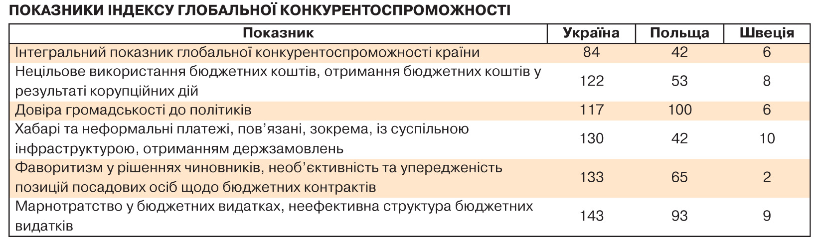 Вагомими факторами ризику для формування бюджетних рішень і, відповідно, для стану бюджетної системи України є, зокрема, нецільове використання бюджетних коштів, висока корупційна складова бюджетних видатків та їх неефективна структура. Це відображається місцем країн за показниками рейтингу глобальної конкурентоспроможності Всесвітнього економічного форуму (див. табл.).