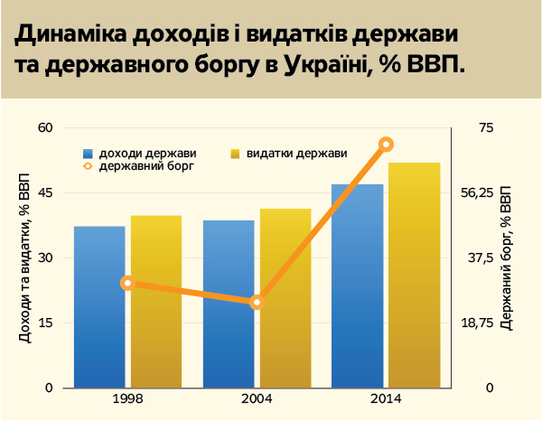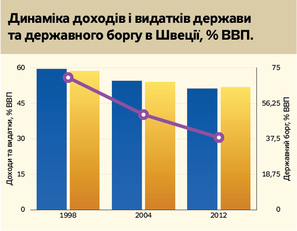 27 функціональних груп бюджетних видатків. При розгляді бюджету в другому читанні кожна пропозиція щодо збільшення асигнувань по окремих підгрупах видатків має отримати більшість голосів для відповідного зменшення інших асигнувань у межах тієї самої групи видатків, оскільки функціональну структуру видатків бюджету вже було визначено в першому читанні. Запровадження цих бюджетних процедур після кризи 1990-х років дало змогу скоротити державний борг із 70% ВВП у 1998 р. до 50% у 2004 р. і приблизно 38% ВВП у 2012 р., а державні видатки - з 60 до 52% ВВП (див. рис.). Відсутність таких процедур в Україні призводить до невпинного зростання як видатків сектора загального державного управління, так і державного боргу.