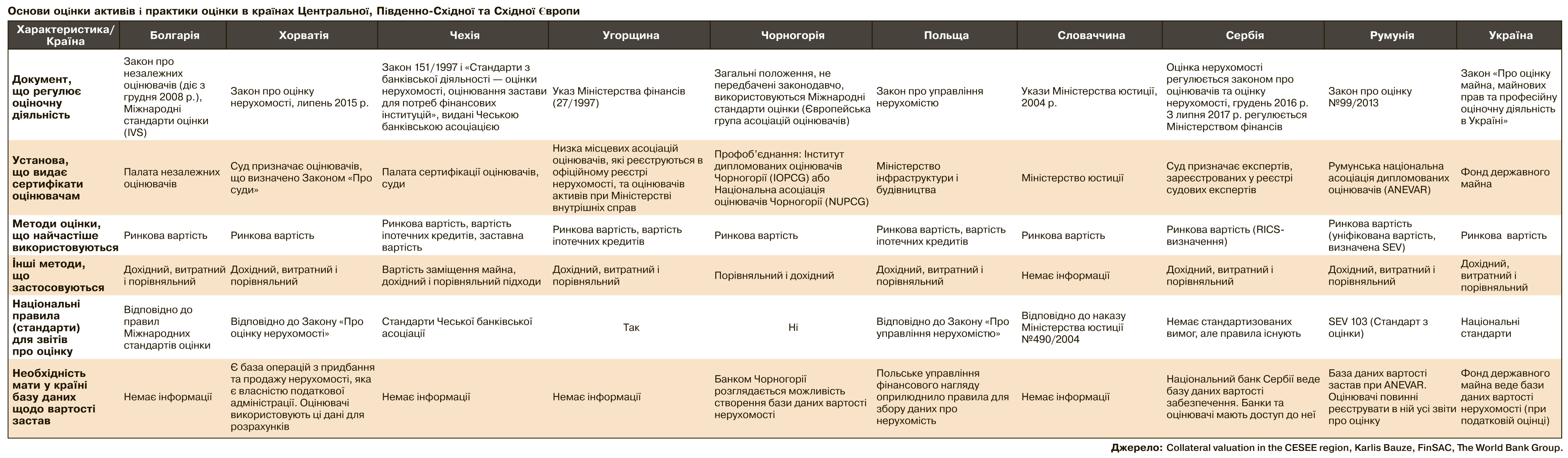 Ключова особливість сектору - діяльність оцінювачів, як правило, регулюється нормами, що прописані поза межами мандата регуляторів фінансових ринків. Так, в Україні оціночна діяльність регулюється Фондом державного майна, який видає сертифікати для здійснення професійної оціночної діяльності суб'єктам і кваліфікаційні свідоцтва оцінювачам. Національний банк України не має юридичних повноважень втручатися у роботу сертифікованих оцінювачів, незважаючи на спроби запровадити деякі правила, спрямовані на поліпшення якості роботи оцінювачів.