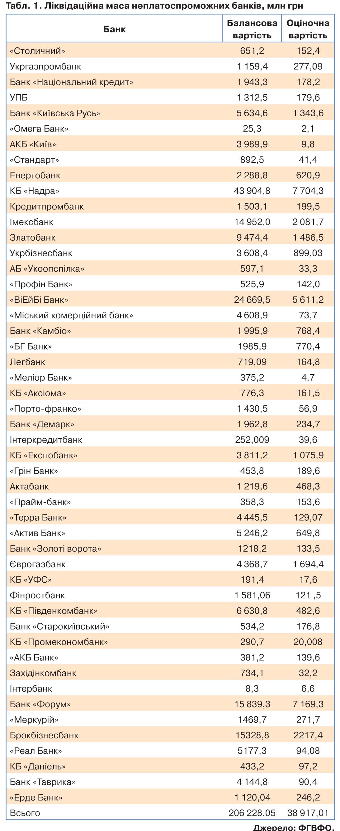 У деяких випадках ліквідаційна маса, за оцінками самого ФГВФО, становить лише 2–3% від балансової вартості задекларованих у банківській звітності активів. У переважній більшості випадків усі більш-менш привабливі активи проблемних банків було виведено задовго до того, як їх визнали неплатоспроможними. На сьогодні в управлінні фонду півсотні банків із загальною сумою активів близько 206 млрд грн. Але сума ліквідаційної маси за цими активами не перевищує і 38 млрд грн.