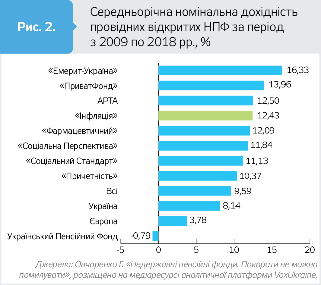 Критика учасниками ринку висновків щодо неспроможності системи недержавного пенсійного забезпечення генерувати доходи учасникам, які містяться у звіті, базується на твердженнях про некоректність вибірки та про хибну інтерпретацію використаних даних. Наприклад, що період вибірки (з 2014-го по 2018-й включно) характеризувався глибокою економічною кризою і найвищими рівнями інфляції та що система НПФ є вкрай неоднорідною, бо включає "чинні фонди, тимчасово заморожені фонди, фонди, створені для співробітників, і фонди для продажу". Розрахунки дохідності лише відкритих НПФ з активами не менш як 10 млн грн, які охоплюють різні часові періоди, у тому числі десятирічний, дають можливість незгодним робити висновки, що результати діяльності НПФ загалом "виглядають доволі пристойно" (рис. 2).