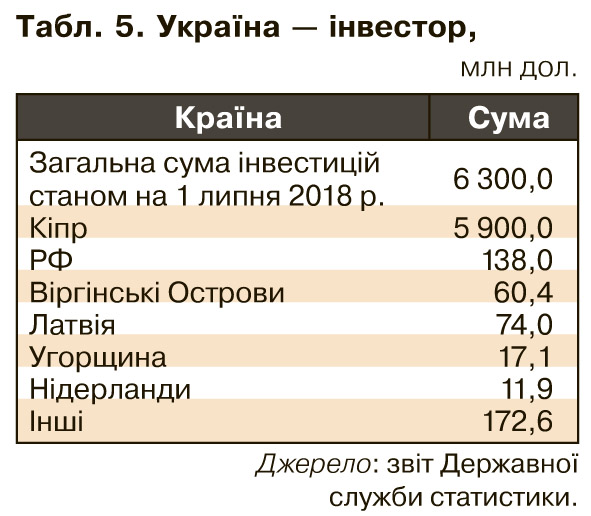 А куди інвестує Україна? 5,9 млрд дол. - Кіпр,138 млн - РФ, 60,3 млн - Віргінські Острови (див. табл. 5). Очевидно, що це схеми виведення капіталу з країни, проте ніяк не інвестиції.