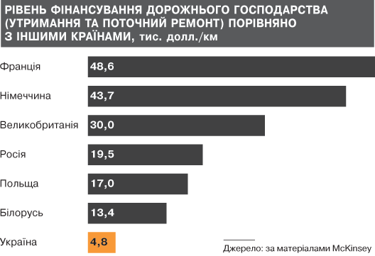 Сьогодні на фінансування дорожнього господарства виділяється 4,8 тис. дол. на кілометр. Це катастрофічно мало навіть порівняно з Білоруссю (у 2,7 разу більше, ніж в Україні) і Польщею (в 3,6 разу), не кажучи вже про Францію і Німеччину, які виділяють на кілометр дороги в 9–10 разів більше, ніж ми.