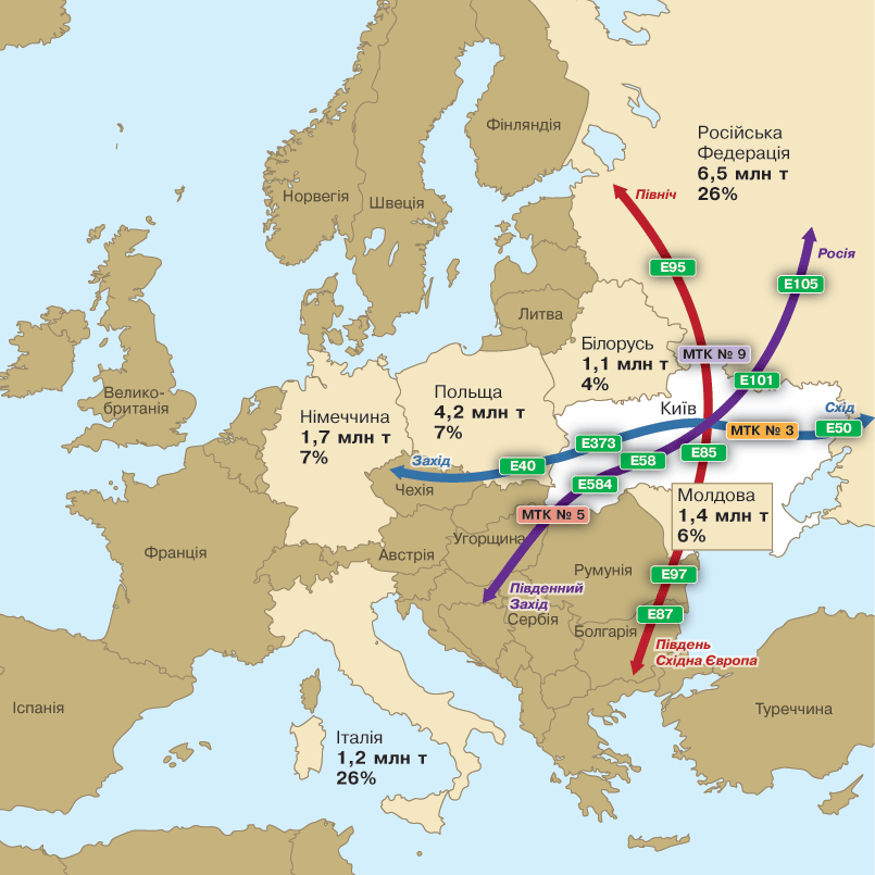 Наша країна має колосальний транзитний потенціал. Ключові транзитні потоки збігаються з основними внутрішніми артеріями і йдуть у чотирьох напрямках. Однак в Україні немає жодного транспортного коридору, який по всій довжині складається з доріг першої категорії.