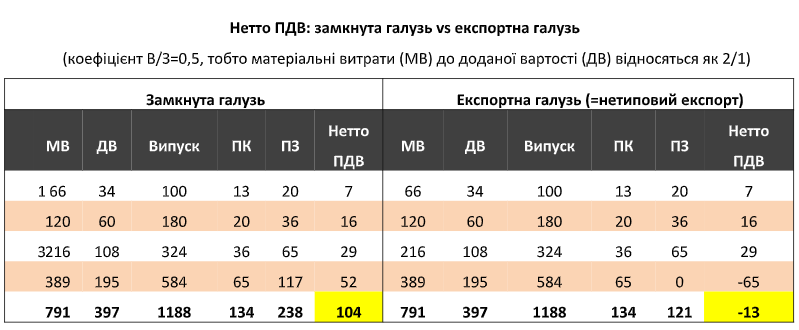 В Україні кількість ланцюгів від сировини до продукції, яка експортується, становить 3–4 виробничі етапи. У таблиці підсумок нетто ПДВ для бюджету для замкнутої галузі та експортної виділено кольором. Цифри говорять самі за себе!