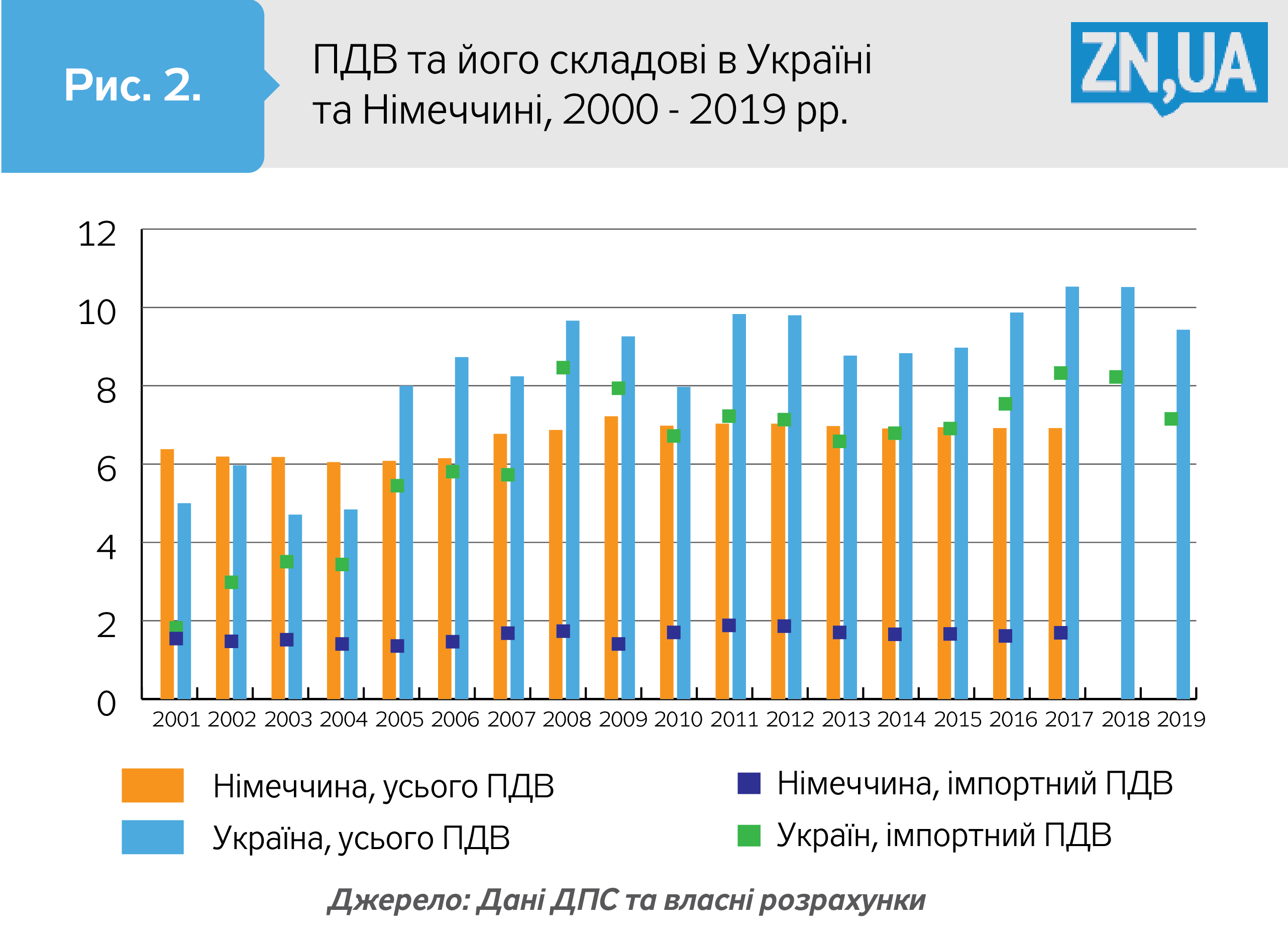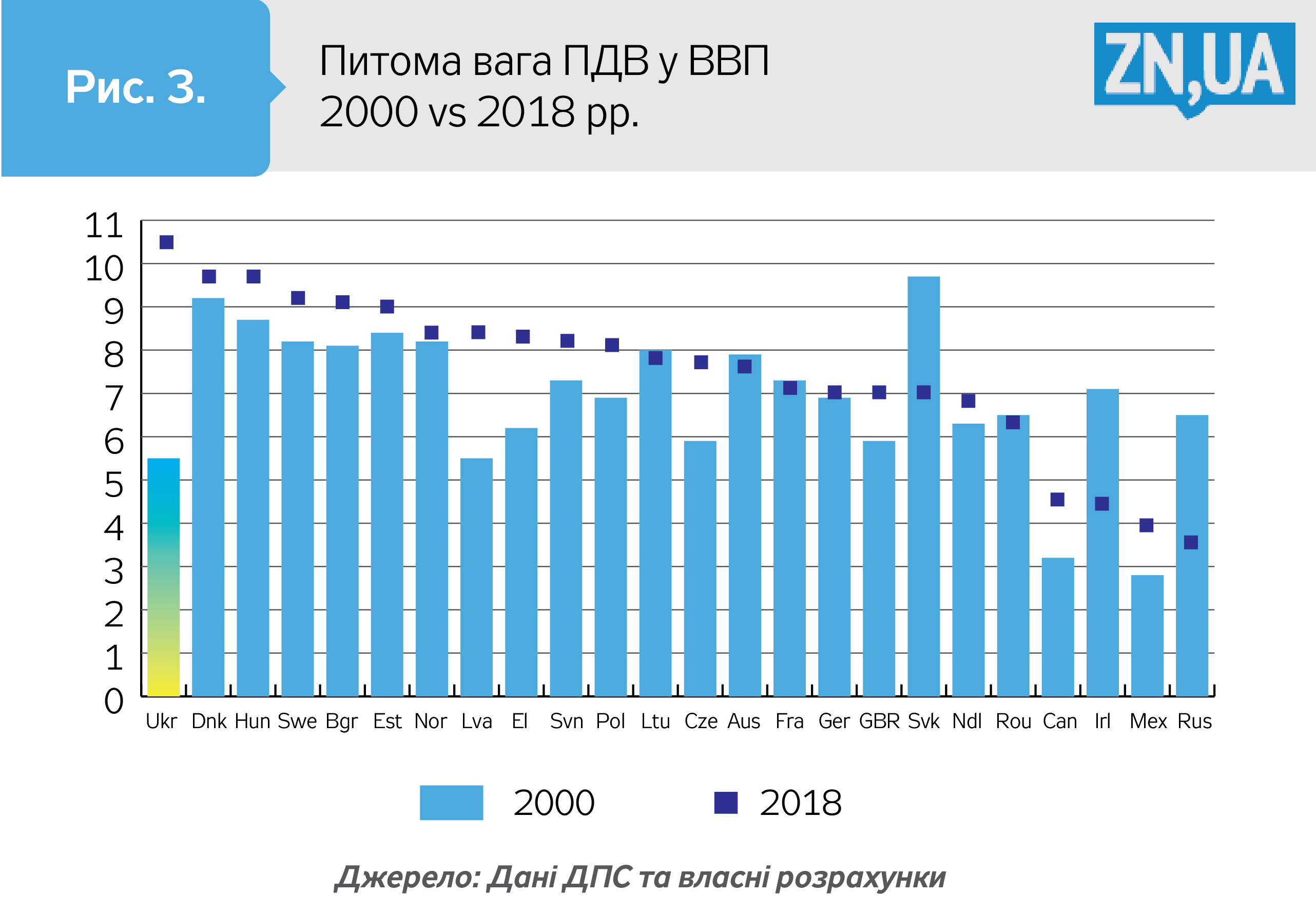 Аби зробити корисні висновки для цілей формування державної податкової політики, здається, варто перейнятися питанням, чому провідна країна ЄС, економіка якої є найпотужнішою, а головне, одна з найбільш технологічно розвинених, має в довгостроковому періоді сталу пропорцію у ВВП як ПДВ, так і його складових? Рисунок 3 підтверджує такий факт: за 2000‑2018 роки приріст частки ПДВ у ВВП в Україні був найбільший із досліджуваної нами вибірки країн.