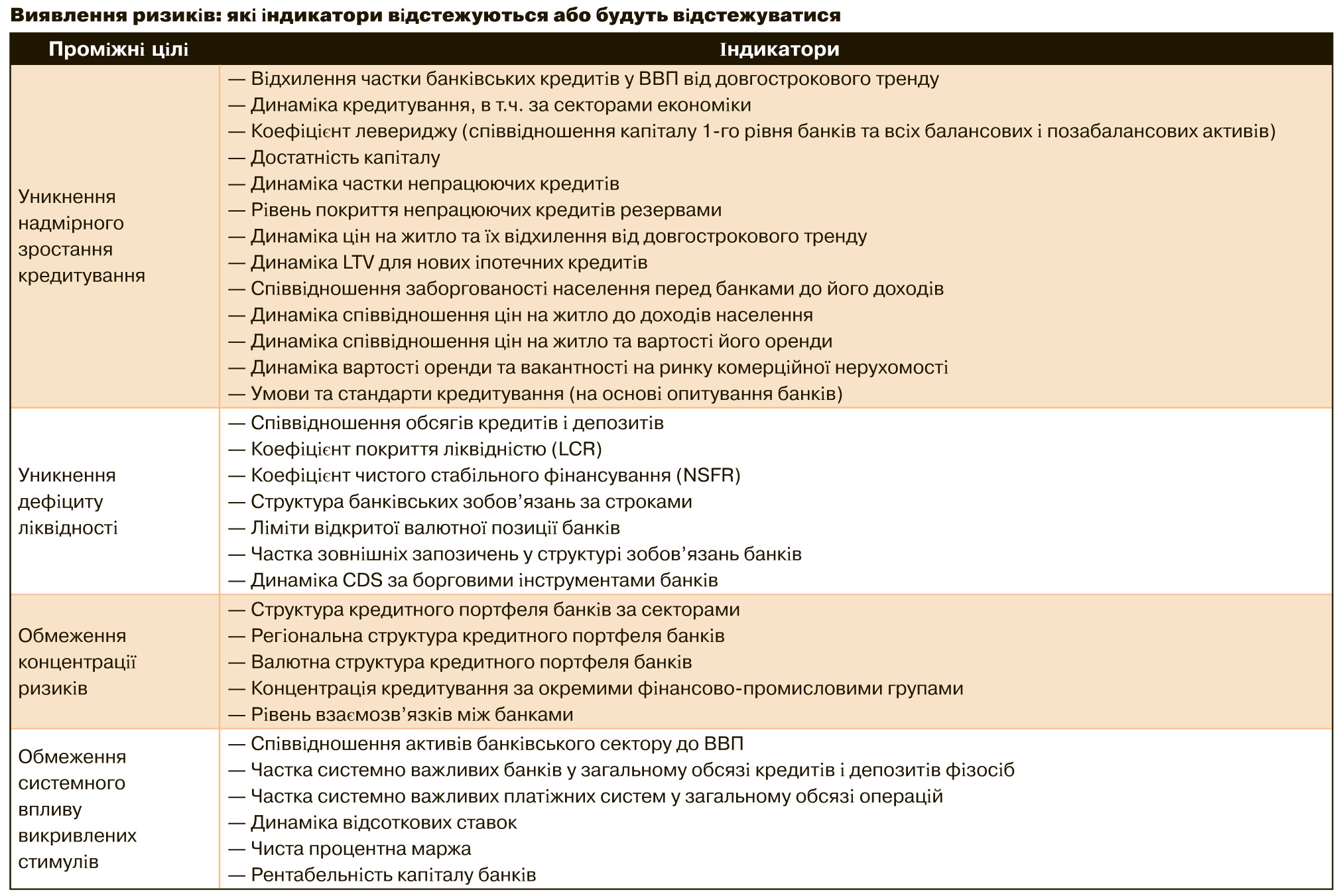 Цикл макропруденційної політики складається з чотирьох етапів: 1) виявлення ризиків; 2) вибір інструментів для пом'якшення цих ризиків; 3) макропруденційне реагування; 4) оцінювання ефективності вжитих заходів. Для виявлення ризиків визначено орієнтовний перелік кількісних індикаторів для відслідковування, що відповідає кожній проміжній цілі.
