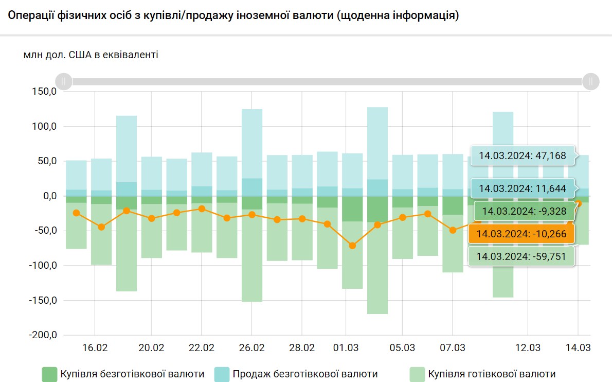 «Чистий продаж валюти НБУ на підтримку курсу за лютий 2024 року скоротився до 1,51 млрд доларів (проти 2,55 млрд дол. у січні 2024 року і 2,68 млрд дол. у середньому за 5 місяців після відв'язування від фіксованого курсу). Це найменший показник інтервенцій від лютого 2023 року», - зазначив він.