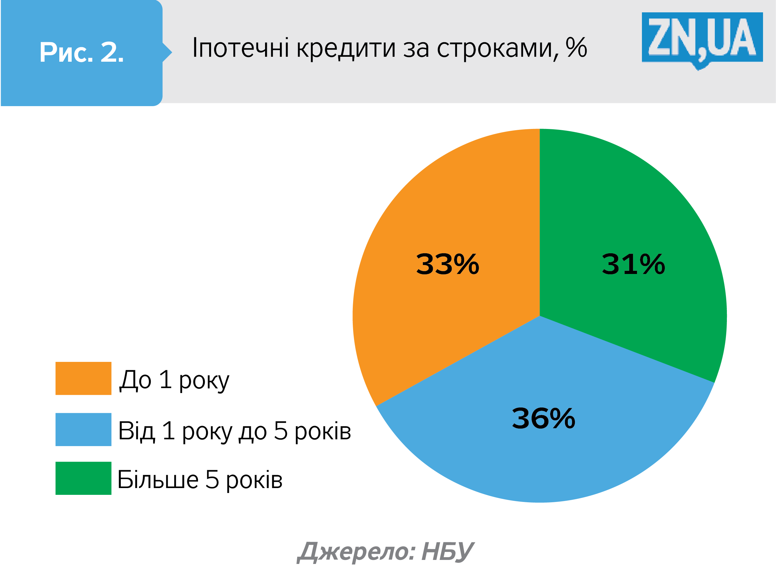 Рівень проникнення іпотеки в Україні становить менш як 4% від ВВП і продовжує знижуватися. При цьому частка довгострокових кредитів (понад п'ять років) становить менш як третину від і без того мізерного обсягу іпотечних кредитів (див. рис. 2).