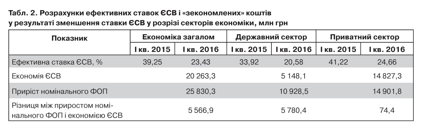 Відповідно до табл. 2 суми збільшення ФОП у приватному секторі та зниження сплати ЄСВ майже збігаються. Натомість у державному секторі збільшення ФОП виявилося майже удвічі більшим, ніж це зумовлено економією на ЄСВ. Причиною є не детінізація зарплат, якої не може бути в державному секторі у принципі, а збільшення грошового забезпечення армії (майже на 69%). Тобто з причин, що ніяк не залежать від зниження ставки ЄСВ, ФОП у державному секторі виріс на суму більшу, ніж економія ЄСВ. Саме ця сума і спричинила перевищення збільшення ФОП по економіці в цілому над сумою зниження ЄСВ. Наведений приклад є досить спрощеним, оскільки ми не знаємо, яким був би ФОП без зниження ставки ЄСВ.