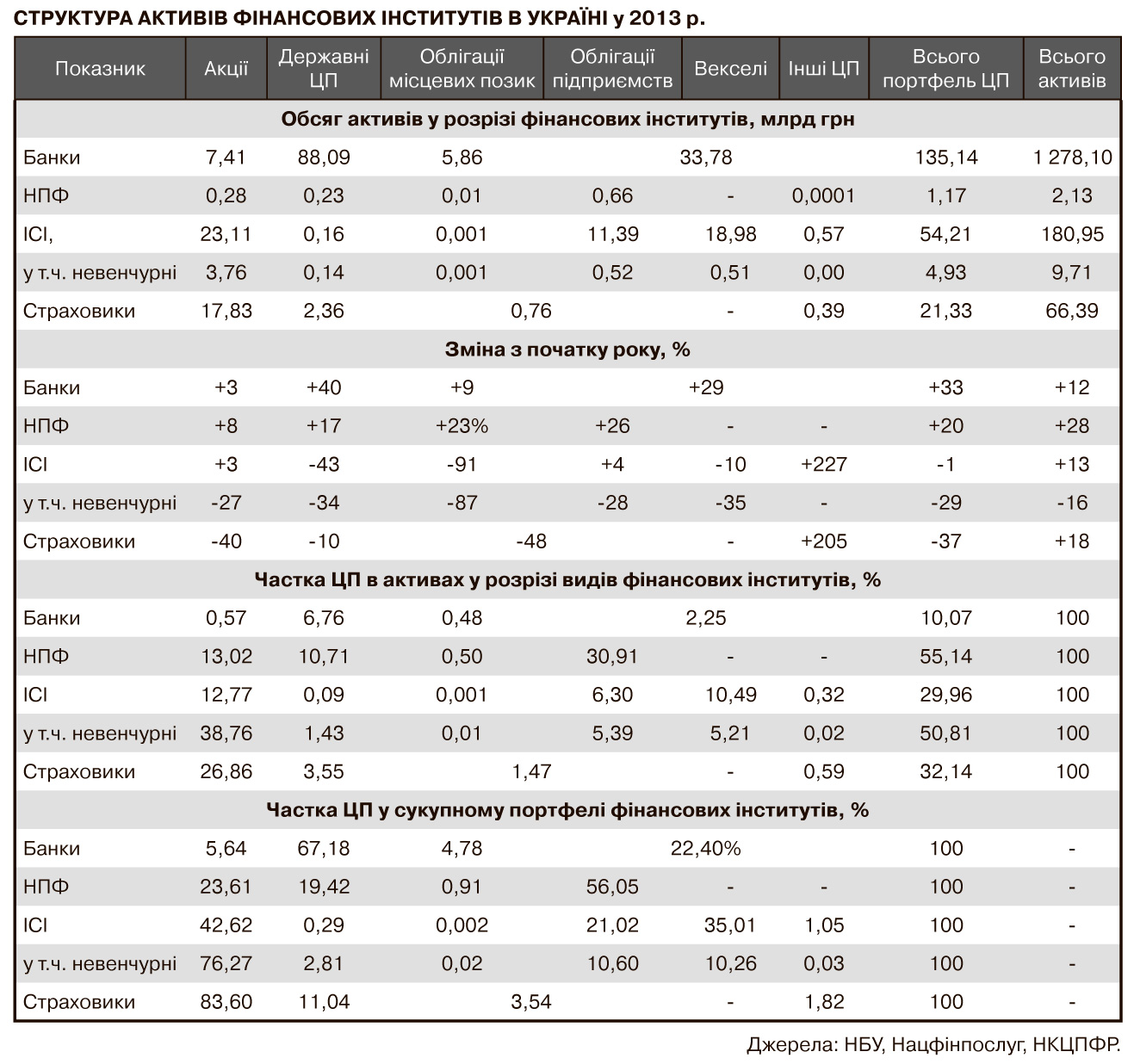 Банки залучили найбільші серед інших інститутів активи (1,3 трлн грн на початок 2014 р.) та є власниками найбільшого інвестиційного портфеля (135 млрд грн, див. табл.). Тому саме їхні інвестиційні вподобання формують інвестиційний ландшафт національного фондового ринку. На 67% інвестиційний портфель банків складається з державних облігацій. І саме цей ринок публічного державного боргу є на сьогодні найрозвиненішим - не в останню чергу через зрозумілість і постійність функцій регулювання (монетарного, бюджетного, податкового) під час комунікацій між єдиним емітентом (державою) та значним колом інвесторів (банками). Було б доцільно поширити цей досвід конструктивного діалогу по осі "емітент-інвестор" і на інші сегменти фінансового ринку.