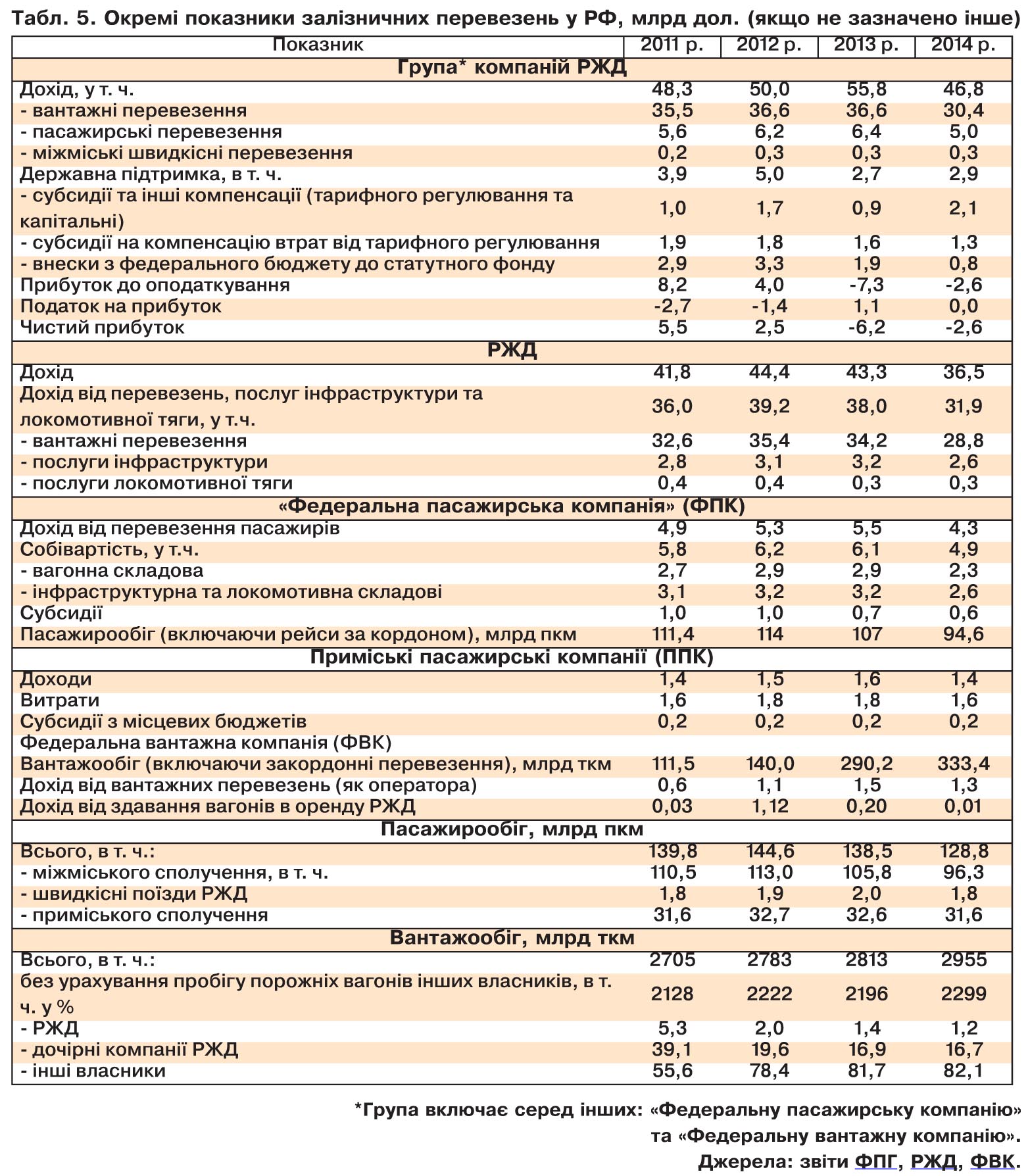 Вартість інфраструктурної та локомотивної складових у РФ виявилася найнижчою - з 1,5 дол./100 ткм у 2012 р. вона знизилася до 0,9 дол. у 2015 р., а внаслідок девальвації рубля очікується їх подальше зниження до 0,6 дол. у 2016 р. Протягом 2012–2014 рр. діяльність з надання послуг інфраструктури та локомотивної тяги була прибутковою. Їх собівартість становила у 2012 р. 1,4 дол./100 ткм, а в 2014 р. - 1,2 дол.