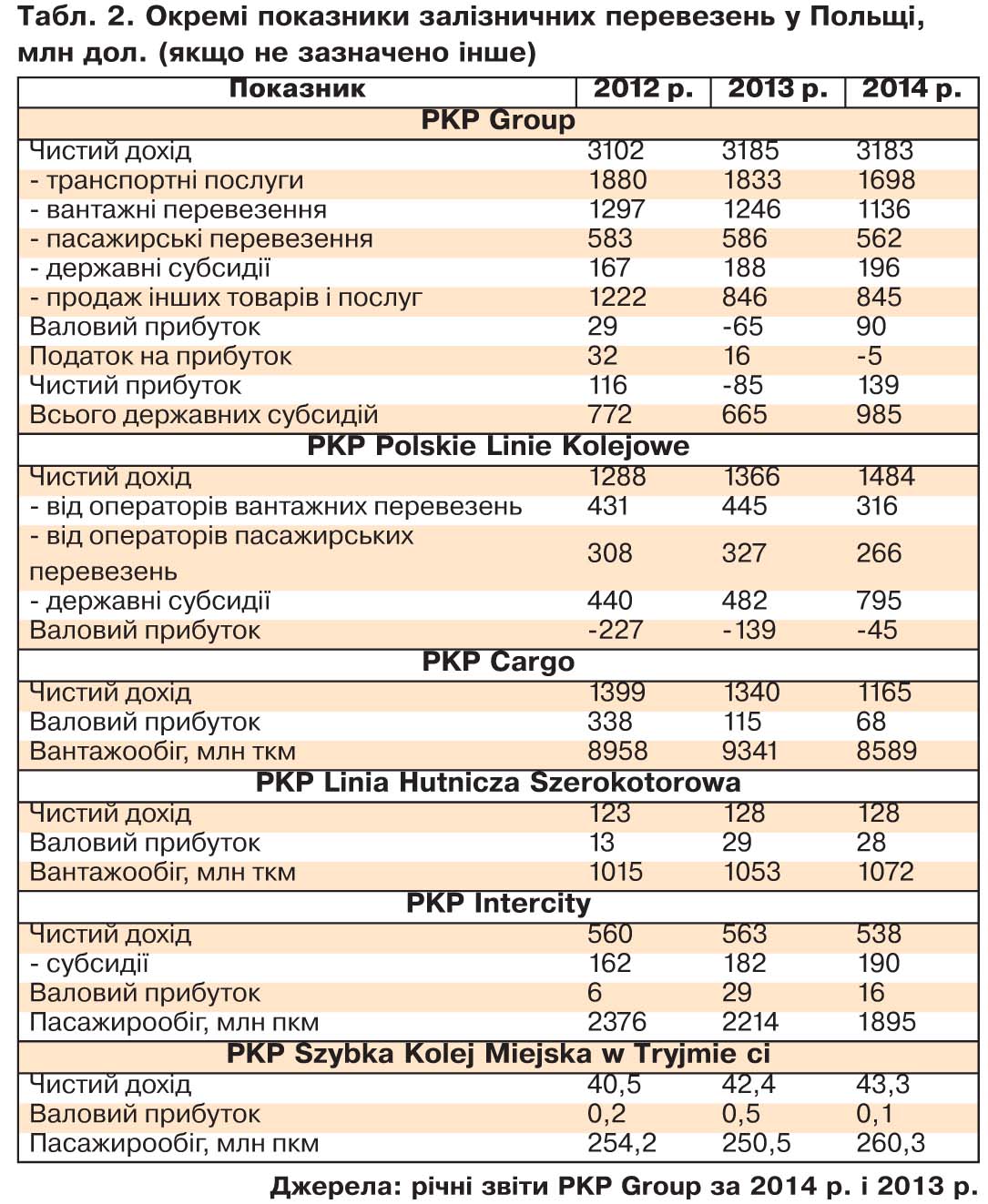 Створена група складається з материнської компанії - PKP SA та 11 компаній, які надають окремі види залізничних послуг, таких, як найбільший оператор вантажних перевезень PKP Cargo, оператор пасажирських міжміських перевезень PKP Intercity та ін. Показники діяльності групи компаній PKP наведено в табл. 2.