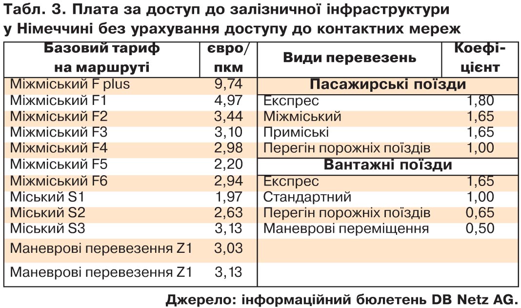 Німеччина. Deutsche Bahn (DB) є найбільшою в Німеччині та Європі і третьою у світі компанією з надання залізничних послуг. Вона поділяється на десяток окремих компаній, які займаються приміськими та міжміськими пасажирськими, вантажними перевезеннями, обслуговуванням колії, електромереж і послугами заправки поїздів, інформатизацією і т.ін. Послуги найдовшої в Європі мережі залізниць (33 тис. км) надає дочірня компанія DB DB Netz AG. Німецьке законодавство також передбачає, що ліцензовані залізничні підприємства, які не входять до структури DB, також мають доступ до цієї інфраструктури. З метою ефективного використання залізничної інфраструктури у 1994 р. DB Netz AG вперше в Європі запровадила ціноутворення поїзного маршруту (TPS 94). У 2001 р. систему ціноутворення на послуги інфраструктури було замінено на більш уніфіковану (TPS 2001), яка застосовується донині. Диференціація тарифів на послуги інфраструктури у 2016 р. залежить від таких факторів: