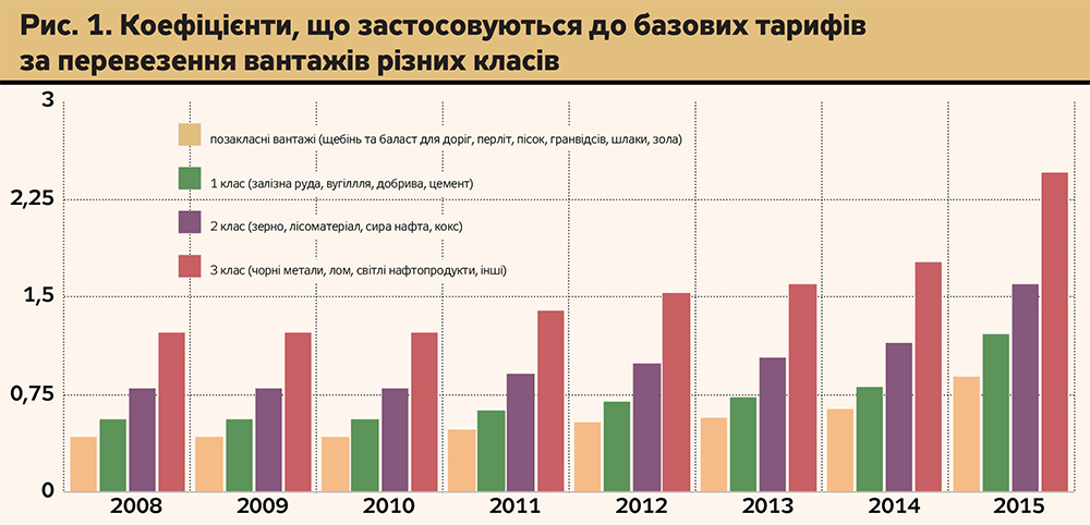 Легше сказати, ніж зробити. Перелічені пропозиції викликали жорсткий супротив ініціативам Мінінфраструктури з боку вантажовідправників, які користуються пільговими тарифами, старої номенклатури працівників УЗ, що звикли ловити рибу в каламутній воді, а також відвертих популістів, які "за все добре і проти всього поганого". За вісім місяців практично жодна ініціатива не наблизилася до реалізації. В цих умовах Мінінфраструктури пішло легшим, але, очевидно, не найефективнішим шляхом - підвищення тарифів для всіх вантажовідправників, без усунення дискримінації в розрізі видів вантажів. Як показано на рис. 1, для таких вантажів, як щебінь, пісок, залізна руда, вугілля, добрива та цемент, на які припадає до 50% від внутрішніх вантажних перевезень, встановлено низькі коефіцієнти, за рахунок чого "Укрзалізниця" здійснює перехресне субсидування виробників і споживачів цих товарів. У свою чергу, власники дорогих вантажів обирають альтернативні варіанти доставки, внаслідок чого УЗ втрачає своїх найкращих клієнтів.