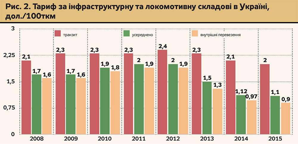 У результаті було встановлено, що з урахуванням поправки на доходи від вагонної складової розмір тарифу інфраструктурної та локомотивної складових в Україні у 2012–2013 рр. становив 2,0 дол./100 км, а 2014-го - 1,5 дол. (див. табл. 1). У 2015 р. він знизився до 1,12 дол./100 км, у тому числі на внутрішні перевезення - до 0,97 дол., тоді як у РФ загальний тариф становив 0,97 дол./100 км, а в Польщі протягом 2012–2014 рр. - 3,6–3,8 дол./100 км. Це більше, ніж в Україні, але ж не в 11 разів. Оскільки у Німеччині тариф поділяється на дуже велику кількість складових, наведемо лише дані щодо загальної вартості вантажних перевезень, які включають також вагонну складову - 5,6–5,7 дол./100 км протягом 2012–2014 рр. Що ж до інфраструктурної складової у Німеччині, яка включає лише рух по коліях і не враховує локомотивної складової, електроживлення і заправки, а також різних додаткових послуг (маневрування, відстій і т.ін.), то її вартість у відповідних роках дорівнювала 1,2 дол./100 км.