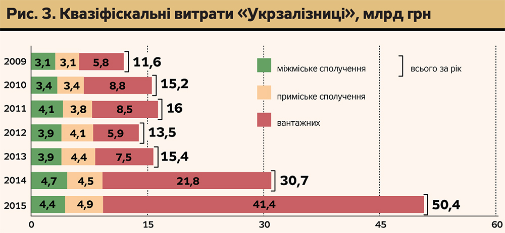 Оскільки у сфері пасажирських перевезень відсутні послуги, які не підпадали б під регулювання держави, за обсяг квазіфіскальних операцій взято збитки від цього виду перевезень, скориговані на недонарахований ПДВ. Встановлено, що відповідні втрати "Укрзалізниці" протягом 2009–2015 рр. становили 54 млрд грн (у т. ч. 28,3 млрд від приміських перевезень і 27,5 млрд. - від міжміських).