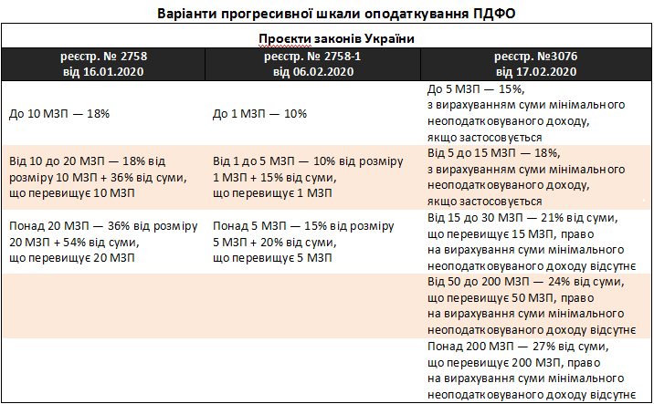 На сьогодні у Верховній Раді України зареєстровано принаймні три законопроєкти (див. табл.), що визначають різні варіанти прогресивної шкали оподаткування ПДФО в прив'язці до розміру мінімальної заробітної плати (МЗП).