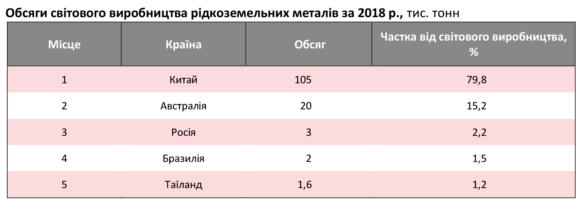 У Китаї сконцентровано 90% світових запасів рідкоземельних металів і таку ж частку від світової кількості підприємств з їхнього видобутку та переробки (див. табл.)
