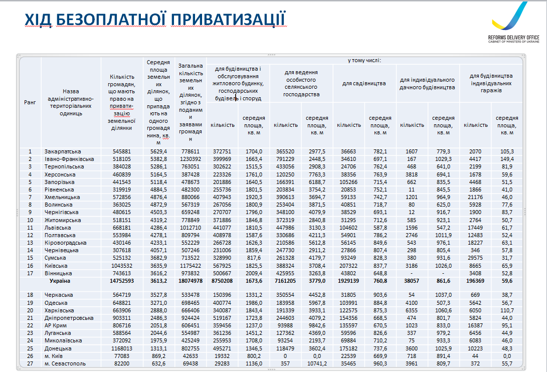 Процес ішов нерівномірно. На нижче наведеній таблиці добре видно, що в Київській , Сумській та Вінницькій областях кількість громадян, які отримали можливість приватизувати земельні ділянки, становить близько половини населення цих регіонів, тоді як у Запорізькій, Харківській областях та Севастополі це право здобули менше чверті місцевого населення.