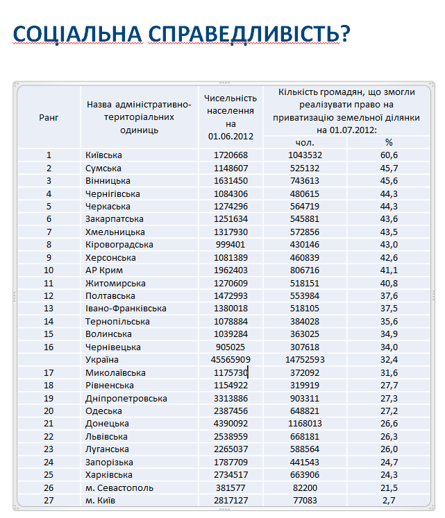 Найнижчий рівень спроможності реалізувати право на приватизацію ділянки у найбільшому місті України — Києві, де ним змогли скористатися лише 2,7 % жителів.
