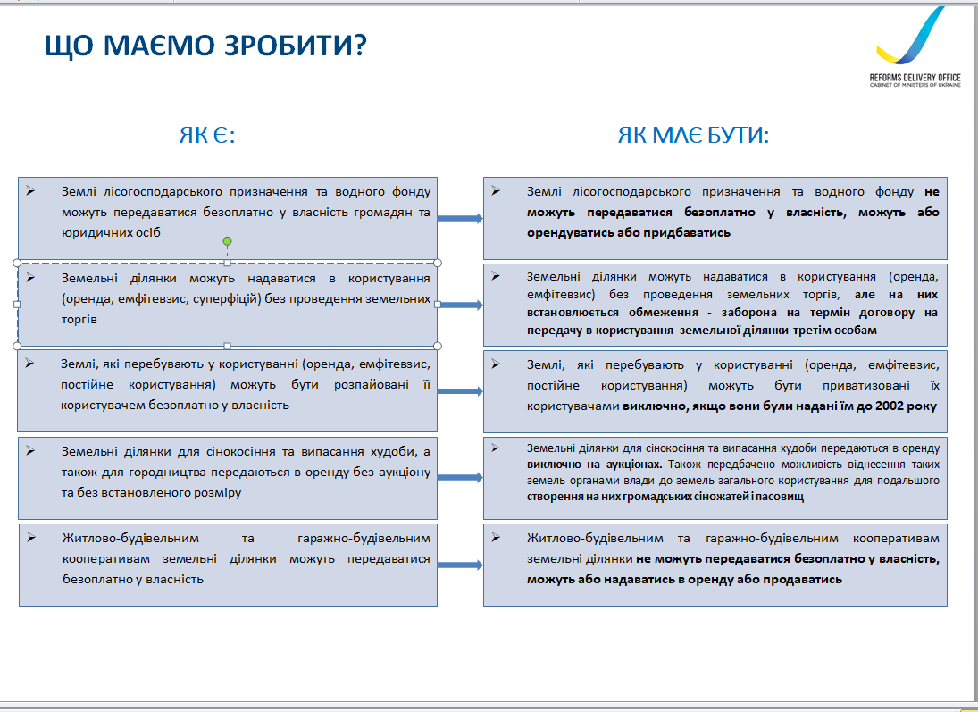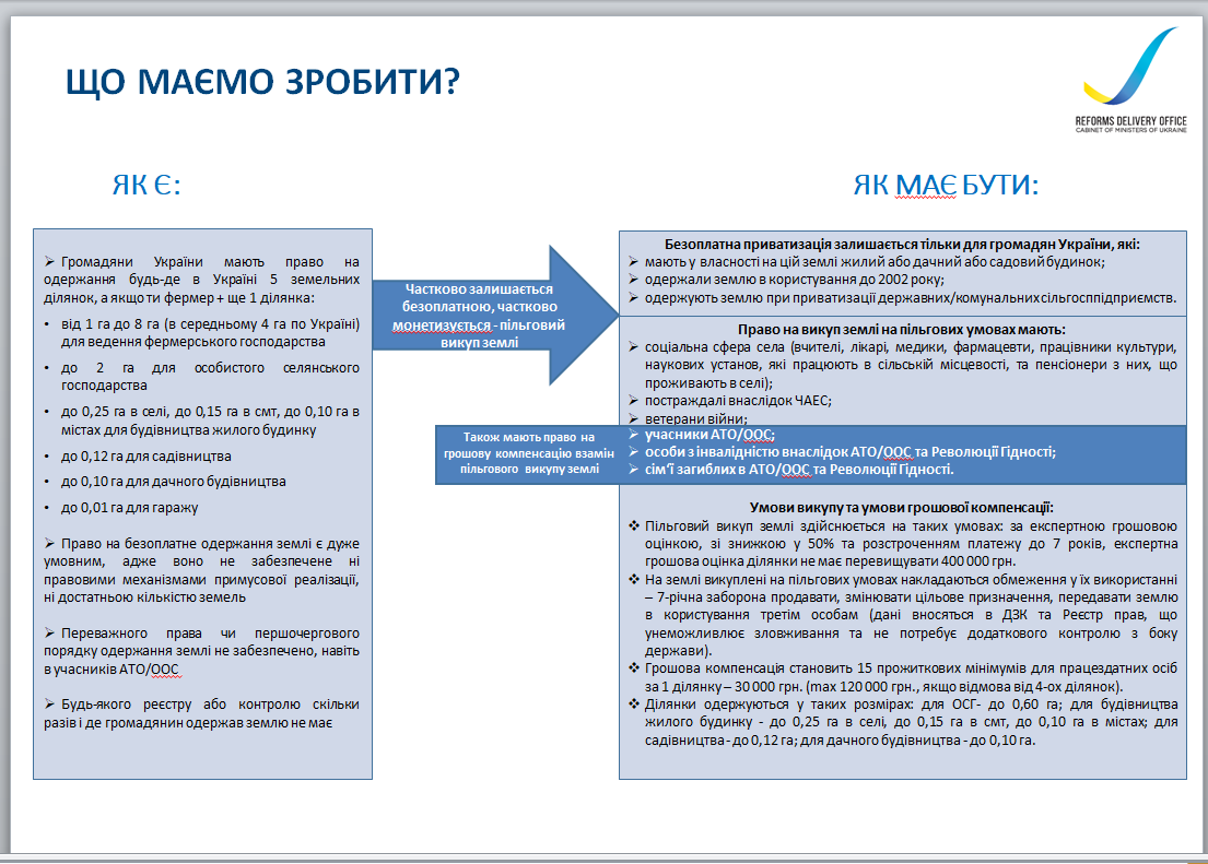 Земля залишилися одним із небагатьох державних активів, які цілком законно могли бути «подаровані» окремо взятому громадянинові керівником обласного управління Держгеокадастру, а після відкриття ринку землі — більшістю депутатів органу місцевого самоврядування тощо.