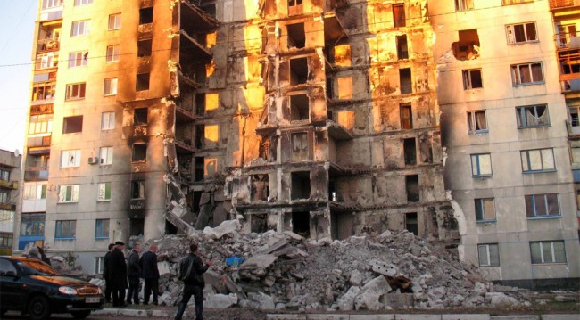 Велетенський шмат фасаду ніби відрубали від будинку. Наче гігантський скульптор-воїн зубилом неймовірного розміру відітнув те, що здалося непотрібним. І рушив далі, у пошуках нового джерела біснуватого натхнення. Почорніла висотка скорбно дивилася на сірий привоєнний світ порожніми очницями вибитих вікон. Назовні стирчали розірвані кишки труб, поламані ребра сходів, перемелені хребці панелей.