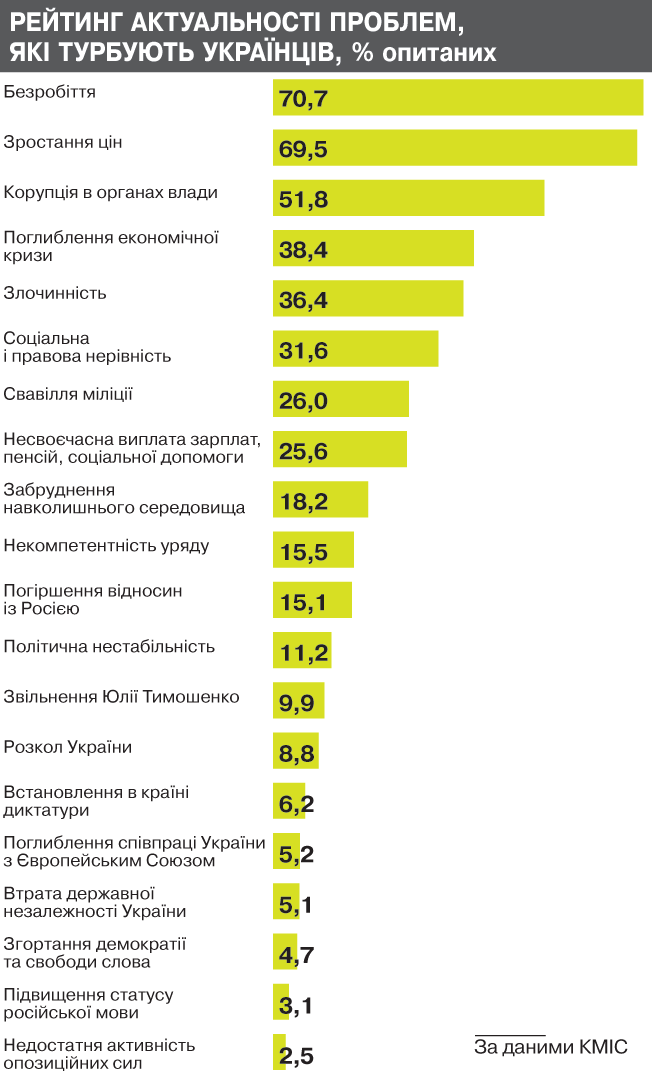 Виміри соціологів підтвердили: пріоритети суспільства мають чітко виражений соціально-економічний характер. Трійка найгостріших бід, із погляду респондентів, - безробіття (70,7%), зростання цін (69,5%) і корупція в органах влади (51,8%). Політична нестабільність у цьому табелі про ранги посідає малопочесне 12-те місце, згортання демократії і свободи слова - 18-те, недостатня активність опозиційних сил -