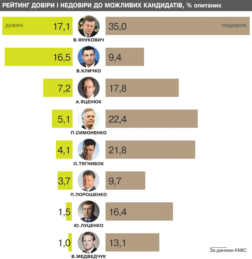 Є ще кілька характеристик, які вирізняють Кличка з-поміж інших здобувачів президентського звання. Мабуть, головна - додатне сальдо довіри. Він - єдиний, у кого рейтинг перевищує антирейтинг (16,5% проти 9,4%). У Януковича - 17,1/35, у Яценюка - 7,2/17,8, у Симоненка - 5,1/22,4, у Тягнибока - 4,1/21,8, у Порошенка - 3,7/9,7.