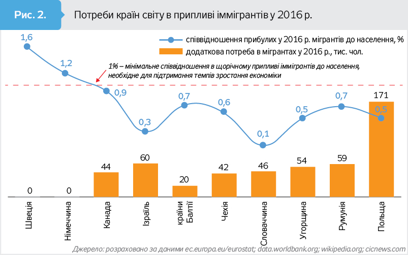 Аналітичний центр Conference Board of Canada стверджує, що країна має щорічно залучати кількість іммігрантів, яка дорівнює 1% її населення. Це дозволить розв'язати проблему скорочення співвідношення працездатних і пенсійних категорій населення, а також зберегти темпи зростання економіки. Подивімося, чи достатньо країни залучають іммігрантів (рис. 2). Якщо взяти 1% населення за норматив потреби країни в іммігрантах, то тільки Швеція і Німеччина змогли витримати його 2016 року. Інші країни його не витягують, причому багато які на 50% і більше. Цим 10 країнам (включаючи три балтійські) треба було 2016 року додатково залучити 0,5 млн людей, щоб підтримати темпи зростання своєї економіки. Враховуючи, що за даними Євростату у всіх цих країнах (окрім Канади) українці є одними з лідерів трудової імміграції - уявіть який щорічний попит на українців вони сформують у наступні 10 років…