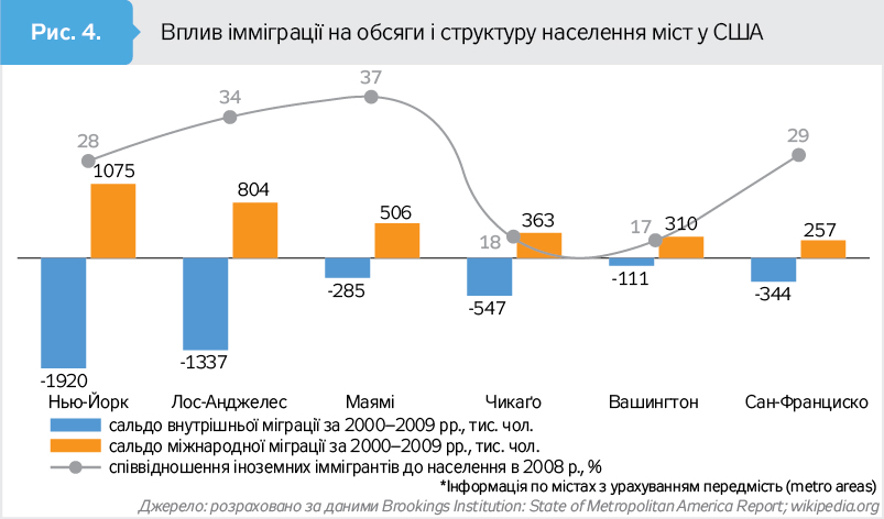 Між містами вже йде боротьба за мігрантів. Наприклад, у США великі молоді міста активно залучають робочу силу внутрішньою імміграцією з найбільших мегаполісів, і єдиний варіант підтримати чисельність населення - залучити іноземних іммігрантів (рис. 4). У багатьох мегаполісах мігранти вже становлять 17–37% населення. Але цього недостатньо. Мегаполіси потребують мільйони нових робочих рук для підтримання й розвитку інфраструктури, обслуговування жителів і бізнесу. При цьому влада приділяє особливу увагу мігрантам-підприємцям, залучення яких дасть змогу сповільнити внутрішню еміграцію й підтримувати на високому рівні збір платежів і податків.