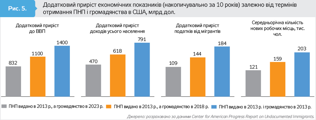 Через погіршення демографічної ситуації та прискорення еміграції дедалі більше країн зазначають, що мігранти потрібні їм тут і тепер. Наприклад, позиція міністерства у справах іммігрантів Канади така: що скоріше мігрант приїде в країну, то швидше буде відчутним соціально-економічний ефект від його життєдіяльності в Канаді. Досвід США також показує: що скоріше легалізувати мігрантів і дати їм громадянство, то швидшим і вищим буде економічне зростання країни. Оскільки це не тільки нові робочі руки, це також споживачі і платники податків. 2013 року в США провели дослідження впливу різних строків легалізації та інтеграції на ключові економічні показники (рис. 5). Якщо мігрантові видати громадянство того ж року, коли й посвідку на проживання (ПНЖ), то додатковий приріст ключових показників (ВВП, доходів населення, зібраних податків, нових робочих місць) збільшиться на 60% порівняно з тим, якщо громадянство надати тільки через 10 років після ПНЖ. Отже, відповідь на це запитання очевидна: якщо країна або місто хоче швидше розвиватися, потрібно швидше залучати іммігрантів, легалізувати їх і видавати громадянство своєї країни.