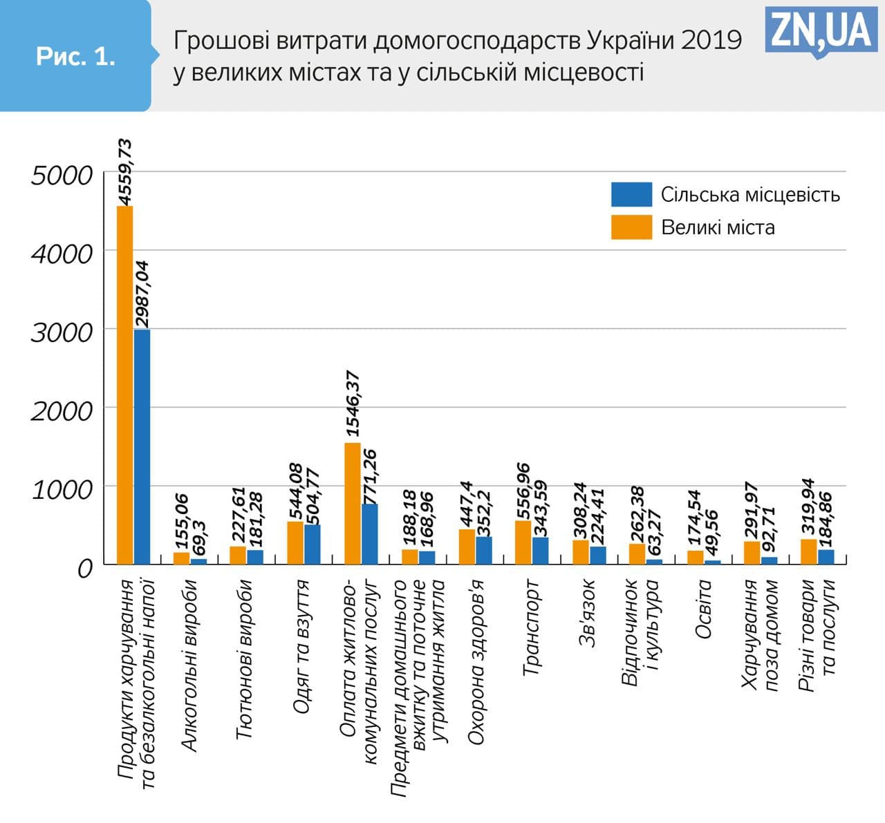 Виявляється, у 2019 р. витрати домогосподарств у великих містах за всіма, без винятку, статтями видатків(!), які досліджують статистики, були вищі, ніж у селах. Особливо це стосувалося витрат на продукти харчування — в 1,5 разу, оплату житлово-комунальних послуг — удвічі, на харчування поза домом та на освіту — утричі, на відпочинок та культуру — вчетверо.