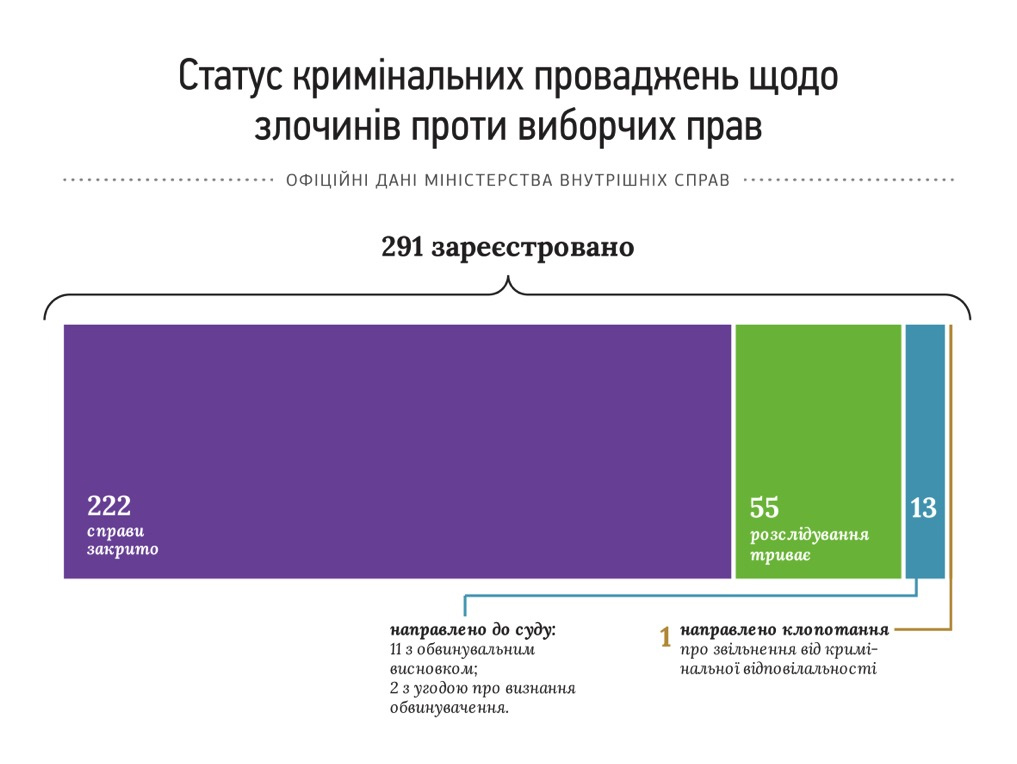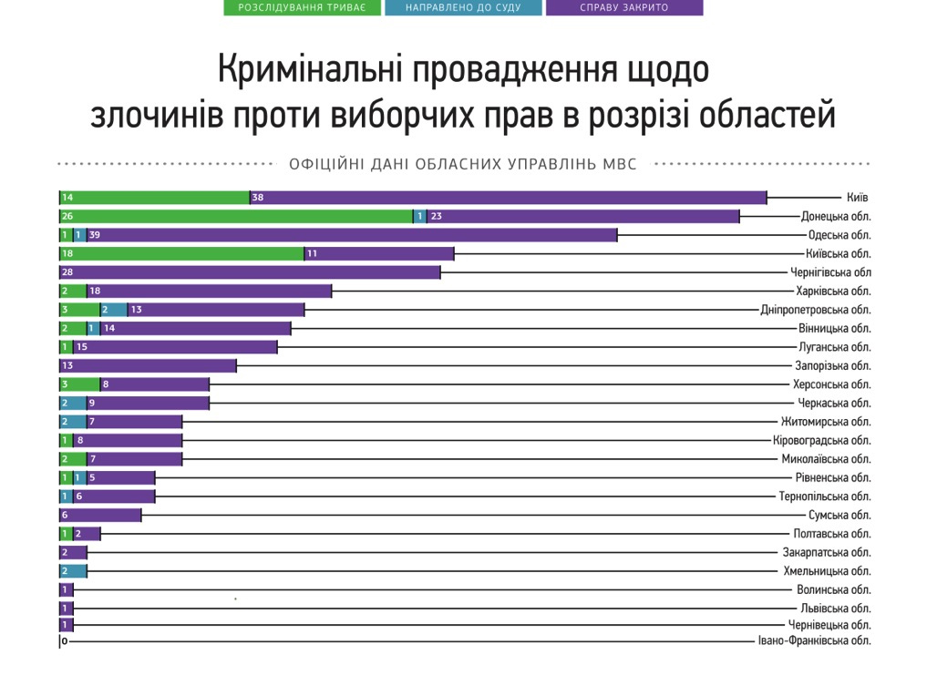 Регіонами-лідерами за кількістю розпочатих кримінальних проваджень щодо виборчих злочинів виявилися м. Київ (52), Донецька область (50), Одеська (41), Київська (29), Чернігівська (28) і Харківська (20). Але, як відомо, кількість не завжди переходить у якість.