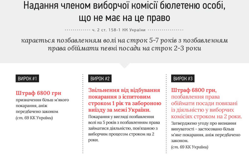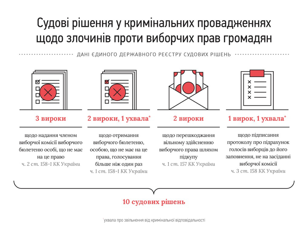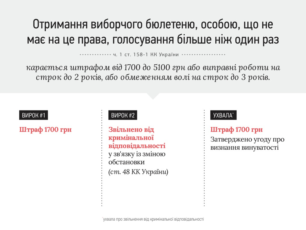 Два вироки й одна ухвала про звільнення від кримінальної відповідальності стосувалися незаконного отримання виборчого бюлетеня, голосування більше ніж один раз