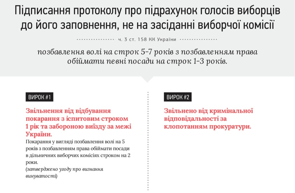 За одним з найпоширеніших порушень парламентської кампанії - незаконне переписування протоколів членами ДВК - винесено лише один судовий вирок і одну ухвалу про звільнення особи від кримінальної відповідальності.