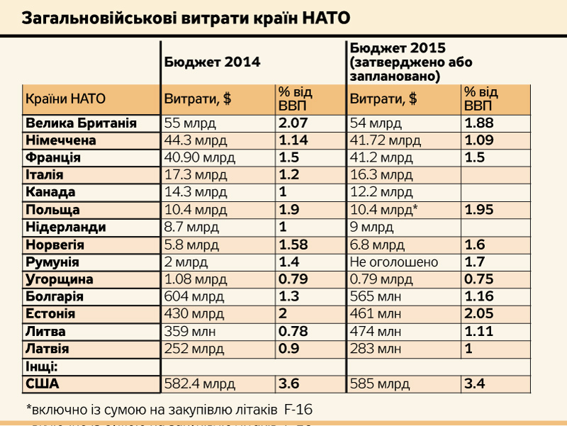 Із початком військової агресії Росії проти України, коли європейська система безпеки стала руйнуватися, на Заході заговорили про збільшення витрат на оборону. В результаті, торік у вересні на саміті в Уельсі лідери країн-учасниць Північноатлантичного альянсу домовилися підвищити свої витрати на оборону до 2% від ВВП.