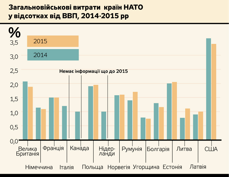 Експерти European Leadership Network у звіті зазначають, що коли у 2014 р. чотири країни НАТО витрачали 2% ВВП на оборону, як цього вимагає статут Північноатлантичного альянсу, то через рік таких лишилося всього дві - Сполучені Штати Америки та Естонія.