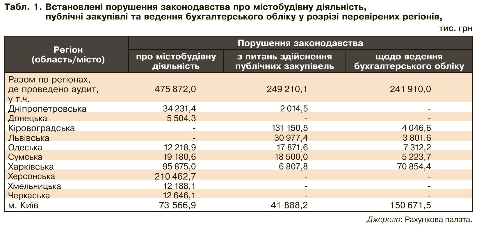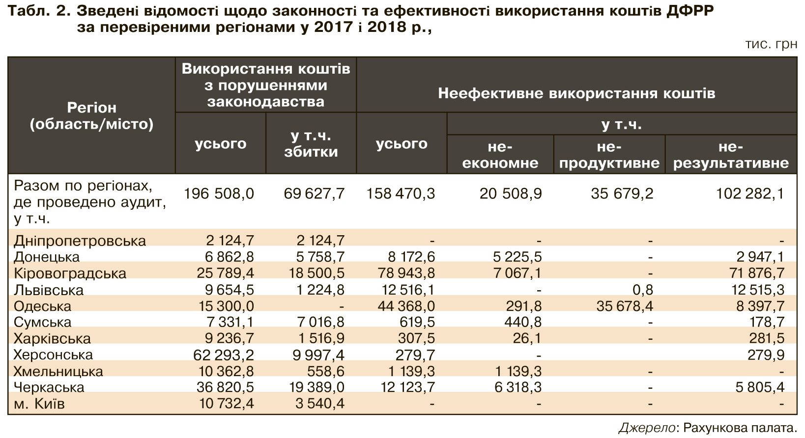 Понад 196,5 млн перевірені регіони витратили із прямим порушенням законодавства, що призвело до збитків в обсязі 69,6 млн грн (див. табл. 2). Кошти невеликі, якщо порівнювати із видатками держбюджету, але якщо глянути на бюджети регіонів, то масштаб проблеми зростає на очах. Тим паче, що за кожною вкраденою або неефективно витраченою гривнею стоять недобудовані садки та школи, аварійні колектори, невідремонтовані тепломережі, незаасфальтовані дороги.
