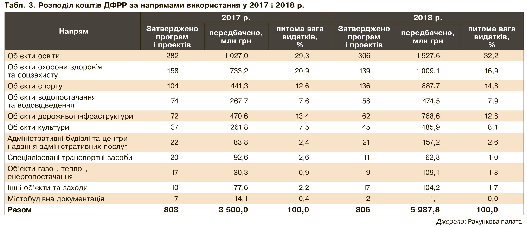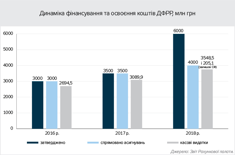 Аудит Рахункової палати охоплював період з 2017-го по 2018 р. У 2017 р. за рахунок коштів ДФРР профінансовано 803 проекти регіонального розвитку, з яких завершено 401 проект, ще 131 проект не було завершено у передбачений термін. Але порівняно з 2018 р. досягнення 2017-го - зразкові. Торік із 450 запланованих проектів не встигли закінчити 238, тобто не виконали більш як половину запланованого.