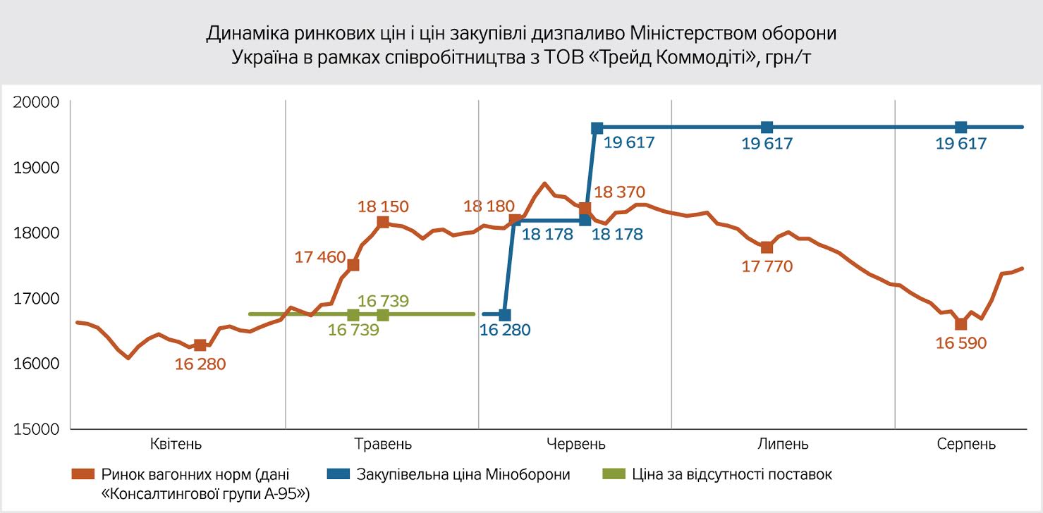 Проте є впевненість, що цих неприємностей постачальник не помітив на тлі наступної благодаті. Свого піку оптові ціни на ринку досягнули 9 червня. Наприклад, за літньою маркою дизпалива вони зросли до 18750 грн/т, але через тиждень у кишені в "Трейд Коммодіті" був контракт на поставку за ціною близько 19600 грн/т. А потім ціни почали буквально обвалюватися, і так тривало аж до початку серпня, коли ціни на ДП упали до 16590 грн/т. Зазначимо, що саме в ці серпневі дні міністр оборони написав, що його відомство закуповує дизпаливо по 16,38 грн/л (близько 19600 грн/т), або на 18% вище ринку. Щоправда, у своєму листі глава оборонного відомства чомусь окремо зазначає, що закупівельні ціни на паливо в Міноборони "значно нижчі за оптові".