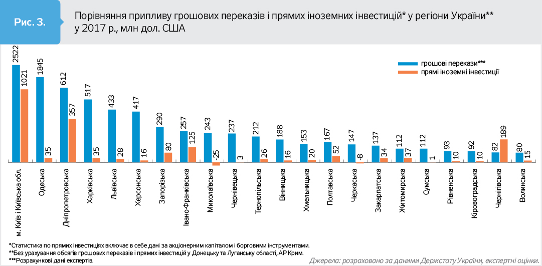 По-четверте, на відміну від іноземних інвестицій, перекази розподіляються досить рівномірно по українських регіонах (див. рис. 3). Аналіз показує, наскільки важливу роль відіграють грошові перекази для кожного регіону країни. Так, у 21 із 22 проаналізованих областей перекази істотно перевищують приплив іноземних інвестицій, причому майже в половині регіонів - у десять разів і більше. Таким чином, ще раз переконуємося у важливій ролі українських мігрантів і грошових переказів для розвитку України та її регіонів.