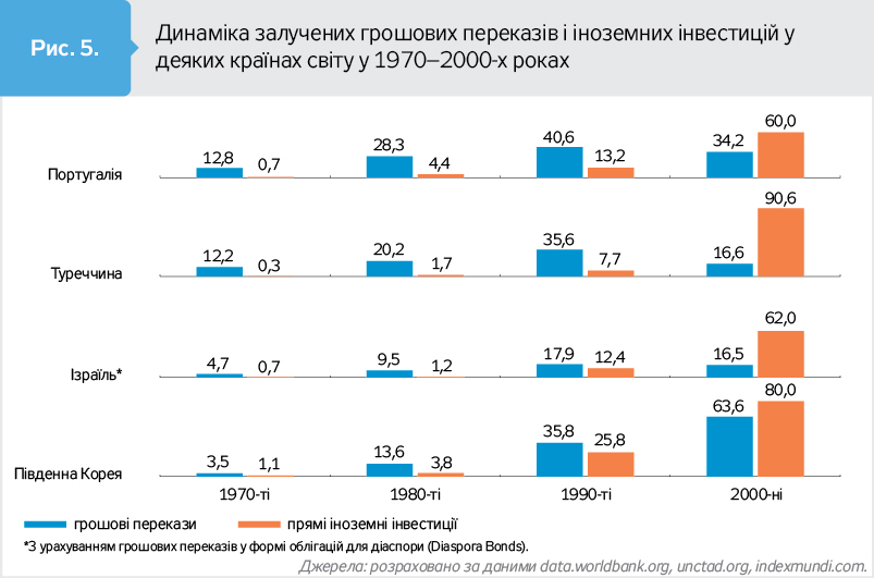 Такі країни як Португалія, Туреччина, Південна Корея, Ізраїль ще в 1970-х зрозуміли, що якщо вони продовжать чекати іноземні інвестиції, то залишаться бідними. Вони активно розвивали політику залучення грошових переказів від своїх мігрантів і діаспори, що допомогло їм істотно збільшити їхній обсяг (див. рис. 5). За 1970–1990-ті роки Португалія завдяки програмам для мігрантів залучила понад 80 млрд дол. переказів (і лише 18 млрд дол. інвестицій), Туреччина залучила 70 млрд дол. переказів (10 млрд), Південна Корея - понад 50 млрд дол. переказів (30 млрд дол. інвестицій). І тільки після 30 років активної політики із залучення грошових переказів у ці країни справді ринули великі обсяги іноземних інвестицій. Завдяки грошовим переказам (у т.ч. з метою інвестування) у цих країнах фактично було створено основу для припливу іноземних інвестицій. Саме перші інвестиційні перекази діаспори, їхня успішна окупність дали зелене світло великим обсягам інвестицій від ТНК та інвестиційних фондів у 2000-х роках.