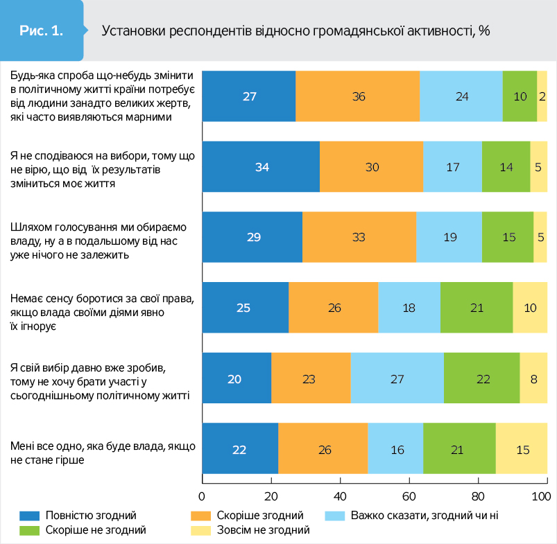 Аналіз відповідей на поставлені запитання дозволяє виділити респондентів, які характеризуються установками на громадянську активність. Їх загальна кількість у вибірці, що представляє доросле населення України, становить 19,7%. Спираючись на відповіді на безліч суспільно важливих запитань, я проаналізував профіль як громадянськи активних, так і громадянськи пасивних респондентів. Так, установка на громадянську активність характерна насамперед для осіб, орієнтованих на творчу діяльність, захист своїх законних інтересів і конструктивне ставлення до навколишніх соціальних реалій. Якщо ж говорити про соціальні групи з мінімальним відсотком громадянськи активних індивідів, то вони характеризуються соціальною апатією, невірою в можливість захисту своїх інтересів і неконструктивним ставленням до соціального оточення.