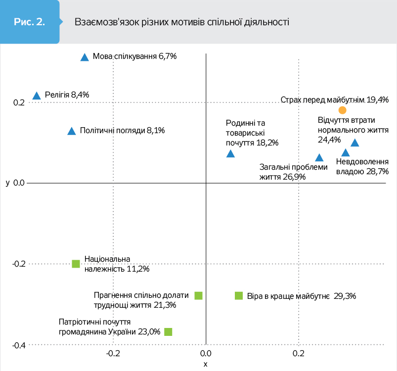 Аналіз цієї діаграми дозволяє виділити кілька груп. Перша включає мову спілкування, релігію та політичні погляди, друга - страх перед майбутнім, відчуття втрати нормального життя, загальні труднощі та невдоволення владою, третя - прагнення спільно долати труднощі, віру в краще майбутнє та патріотичні почуття громадянина України. Мотиви родинних і товариських почуттів, а також національної приналежності займають відносно самостійні позиції.