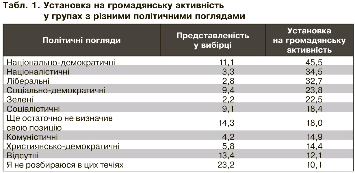 Тепер розглянемо ці дані як основу для соціологічного діагнозу нашого суспільства. Величина правих політичних сил (християнські демократи, націонал-демократи й націоналісти) трохи менша, ніж лівих (соціал-демократи, соціалісти і комуністи): 20,2% проти 22,7%. При цьому кількість громадянськи активних вища серед перших: 7% усієї вибірки проти 4,5% всієї вибірки. Останній момент створює переваги для прибічників правих політичних ідей: їхнім активістам легше знаходити однодумців у своєму середовищі, отже - ефективно відстоювати свої інтереси. Найбільшою мірою це правильно стосовно націонал-демократів. Своєю чергою, їхня потенційно активніша діяльність є доброю підставою для залучення нових послідовників із числа тих, хто ще остаточно не визначив своєї позиції.