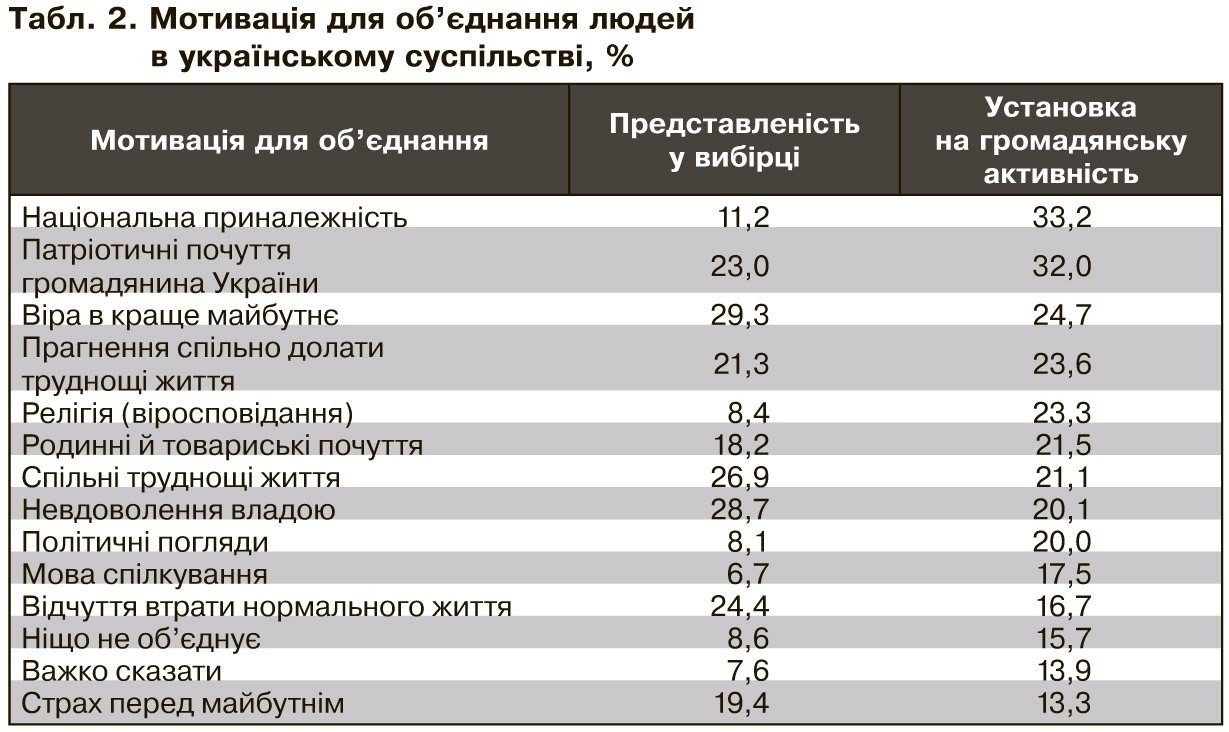 Щоб оцінити ймовірність реалізації кожної з них, звернімося до того, як респонденти оцінюють мотивацію до об'єднання в українському суспільстві, а також приділимо увагу кількості респондентів, які демонструють установки на громадянську активність у кожній із відповідних груп: