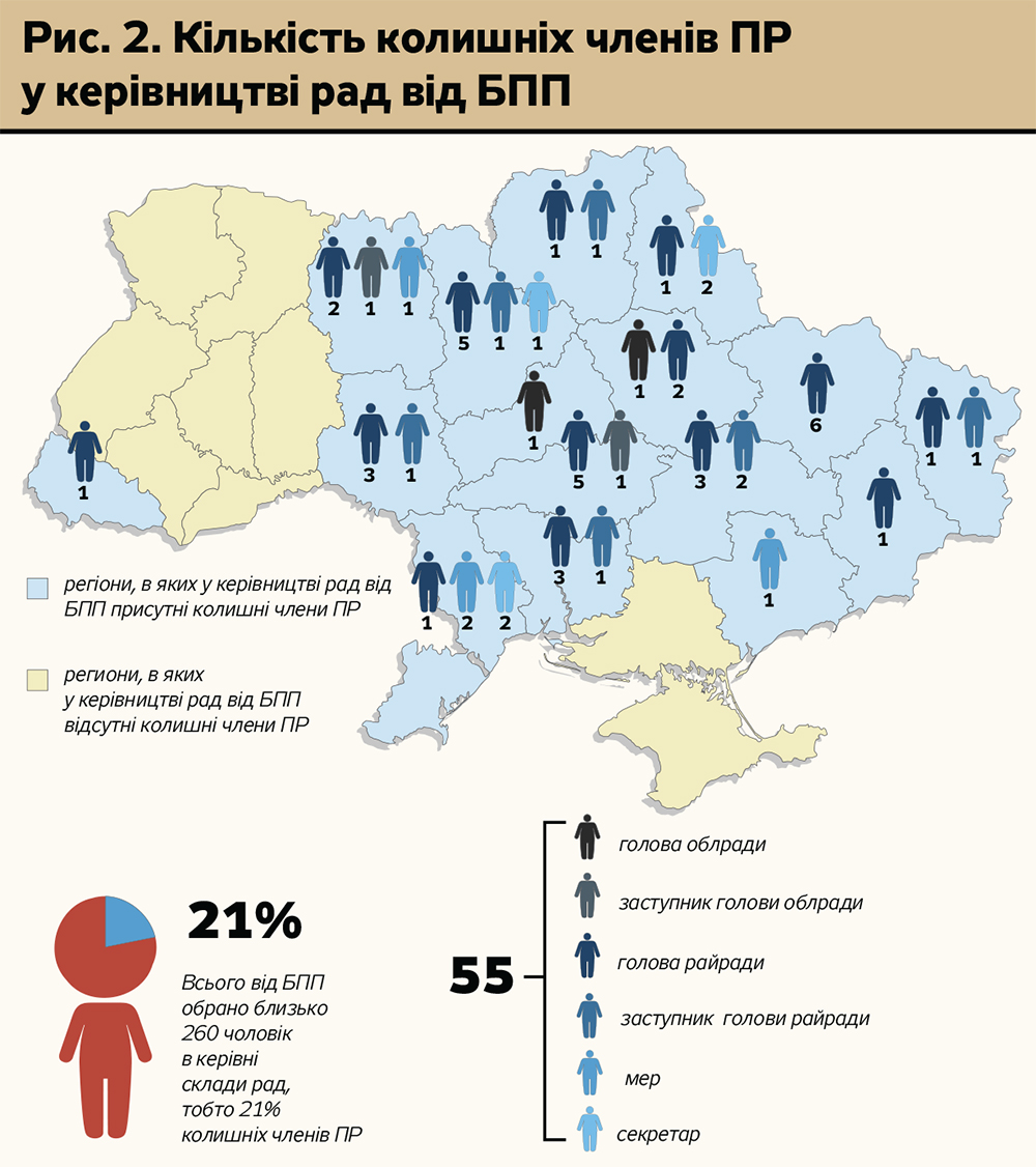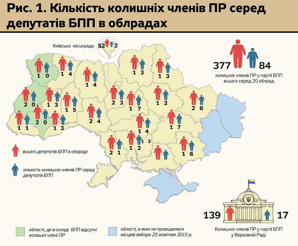 Таким чином, 84 депутати обласних рад із 377 тих, хто прийшов від БПП, - колишні члени ПР. Що становить без малого чверть (22%) президентського депутатського корпусу в регіонах. (Не забуватимемо при цьому, що 17 народних депутатів із 139 від БПП - також вихідці із ПР). Як з'ясувалося, партія Януковича виявилася надійним кадровим резервом для партії Порошенка.
