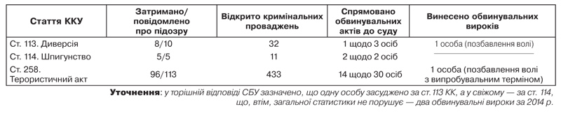 На жаль, дані, отримані автором від самої СБУ, разюче відрізняються від наведених президентом і покладених ним в основу високої оцінки. Ще наприкінці минулого року, після виявлення в реєстрі судових рішень окремих курйозних випадків звільнення від кримінальної відповідальності осіб, котрі притягувалися за статтями Кримінального кодексу про шпигунство, диверсії та терористичні акти (ст. 113, 114, 258 ККУ), в СБУ був надісланий інформаційний запит і отримана відповідь. Для повнішої картини нинішнього року був надісланий такий самий запит, і 2 квітня надійшла відповідь СБУ. Таким чином, ми маємо у своєму розпорядженні дані за 2014 р. (з початку АТО) і перший квартал нинішнього року.