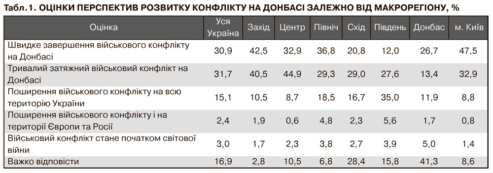 Загалом більшість українців вважають, що конфлікт на Донбасі не буде затяжним. Приблизно 60% переконані, що він триватиме не більше ніж півроку, а 22% - що закінчиться за один-два місяці. Однак 7,5% опитаних вважають, що конфлікт може закінчитися через рік, 6 - не раніше ніж через рік, і 7% побоюються, що бойові дії розтягнуться на кілька років. Але при цьому більшість опитаних вважають, що конфлікт залишиться локальним і не пошириться за територію Донбасу. На швидке завершення воєнного конфлікту на Донбасі розраховує третина (31%) українців, майже стільки ж (32%) вважають, що він буде затяжним, але за межі Донбасу не вийде. Близько 15% побоюються поширення воєнного конфлікту на всю територію України, і найбільше цього бояться жителі південних областей (35%).